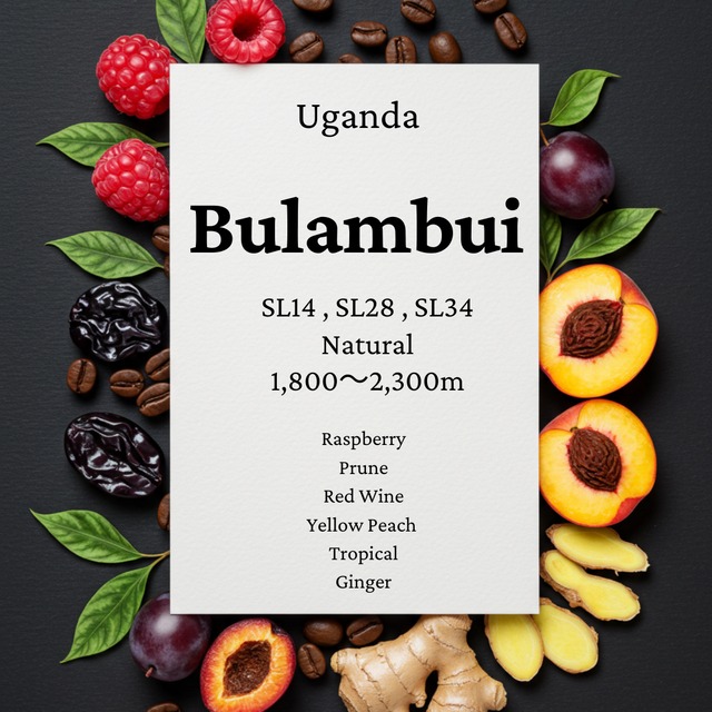 「ラズベリーとプルーンの芳醇さ」 二段階で果実味を楽しめるでしょう。爽やかなラズベリーを感じ、温度が下がってきたところでプルーンのようなボディと質感に変わっていきます。奥の方では生姜が顔を出してきます。 *生産地情報 品種:SL14、SL28、SL34 地区:マウントエルゴン ブランブリ 精製方法:Natural 標高:1,800〜2,300m *Story ウガンダ東部、ケニアとの国境地域にそびえるマウントエルゴンは同国を代表するスペシャルティコーヒーの生産エリアです。この標高4000mを超えるアフリカを代表する火山の麓でブランブリ ウォッシングステーション(以下、WS)は2022年から操業を開始しました。この自然豊かな地域の小規模生産者たちが栽培し、運び入れたたチェリーを使用してWSはコーヒーの生産を行っています。 ラズベリーやプルーン、イエローピーチの華やかなフレーバーがウガンダの高いポテンシャルを感じさせます。力強いボディと甘さもあり、それぞれの焙煎度合いでアフリカらしい個性を発揮するナチュラルです。 --以下共通事項--- *内容量:100g *状態:豆のまま(香味を存分に楽しんでいただくためのこだわりです) *焙煎日:ご注文より営業日3〜5日以内に焙煎し、発送いたします。 *お取り扱い:開封後はしっかりと密封して、涼しい場所に保管してください。 *その他の情報や注意事項 - アレルギー情報:特にアレルゲンは含まれておりませんが、他の食品と同じラインで製造しております。
