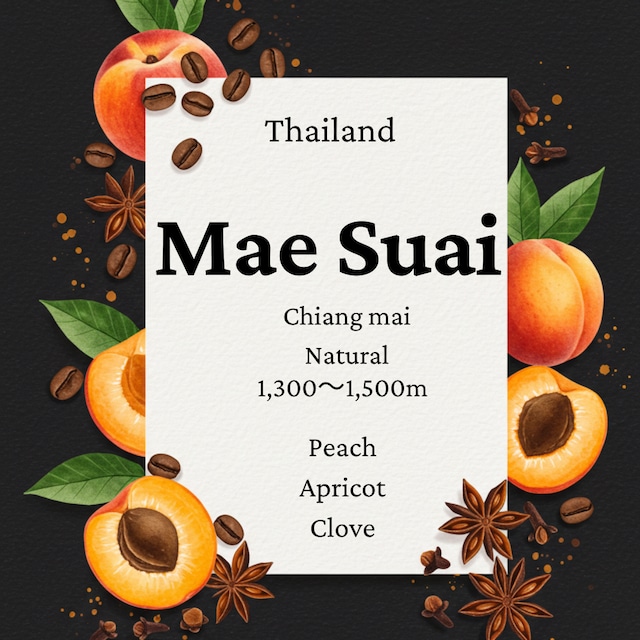 「アジアなのに、アフリカに来たみたい」 万人に受け入れられるNaturalです。店主は、アフリカとアジアの良点を持ち合わせていると感じました。ピーチや杏のフレーバーを感じつつ、酸味は落ち着いています。飲み口に八角のようなスパイシーさも漂う印象に心惹かれました。 *生産地情報 品種:カトゥアイ、ティピカ、チェンマイ 地区:チェンライ県メースアイ地区 精製方法:Natural 標高:1,300〜1,500m *Story 1970年代からアラビカ種を栽培していましたが、麻薬の原料となるケシ栽培が盛んでした。地元住民への健康被害が甚大であったため、コーヒーや果物の栽培を大きく推奨しました。これが「ケシ栽培撲滅ロイヤルプロジェクト」です。 そして生産者の平均年齢が38歳と若く、世界の消費国やトレンドや動きを捉え、超マイクロロットとも呼べるコーヒーづくりを行い、メジャーな生産国に品質は引けを取ることはありません。 --以下共通事項--- *内容量:100g *状態:豆のまま(香味を存分に楽しんでいただくためのこだわりです) *焙煎日:ご注文より営業日3〜5日以内に焙煎し、発送いたします。 *お取り扱い:開封後はしっかりと密封して、涼しい場所に保管してください。 *その他の情報や注意事項 - アレルギー情報:特にアレルゲンは含まれておりませんが、他の食品と同じラインで製造しております。