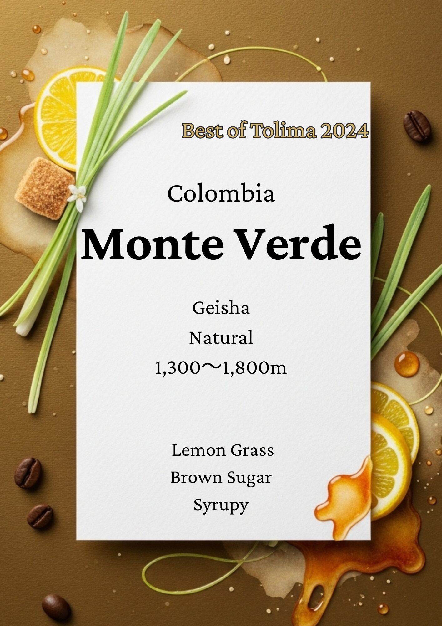 Best Of Colombiaオークションは2024年に開催されたコーヒーコンペティションです。Monte Verde農園ではGeisha品種を植えており、"Best Of Tolima"に選出されました。